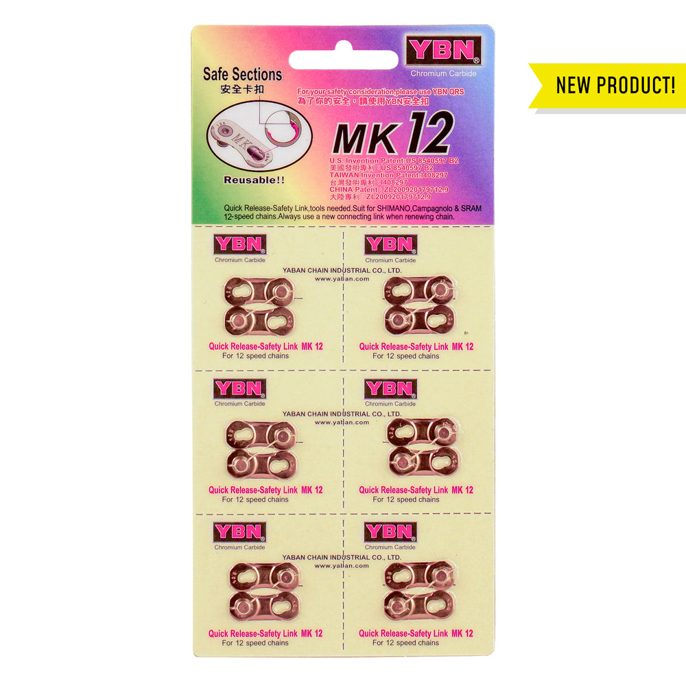 Compatible with SRAM 12sp flattop chains (and of course YBN 12sp flattop chains); available in five colors; replace link after five uses or when chain is replaced; for simple installation and removal use YBN's master link tools found in our Tools & Equipment section.